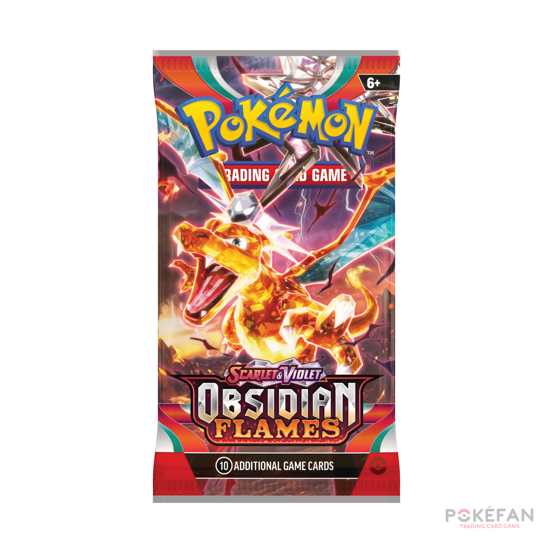 Red-hot embers illuminate the pitch-black night and sparks flare into an inferno as Charizard ex surges forth with newfound powers of darkness! The glittering Terastal phenomenon imbues some Pokémon ex like Tyranitar, Eiscue, and Vespiquen with different types than usual, while Dragonite ex and Greedent ex show mastery of their own inner strengths. Not to be outdone, Revavroom ex, Melmetal ex, and more Pokémon promise to change the course of battle in the Scarlet & Violet—Obsidian Flames expansion.